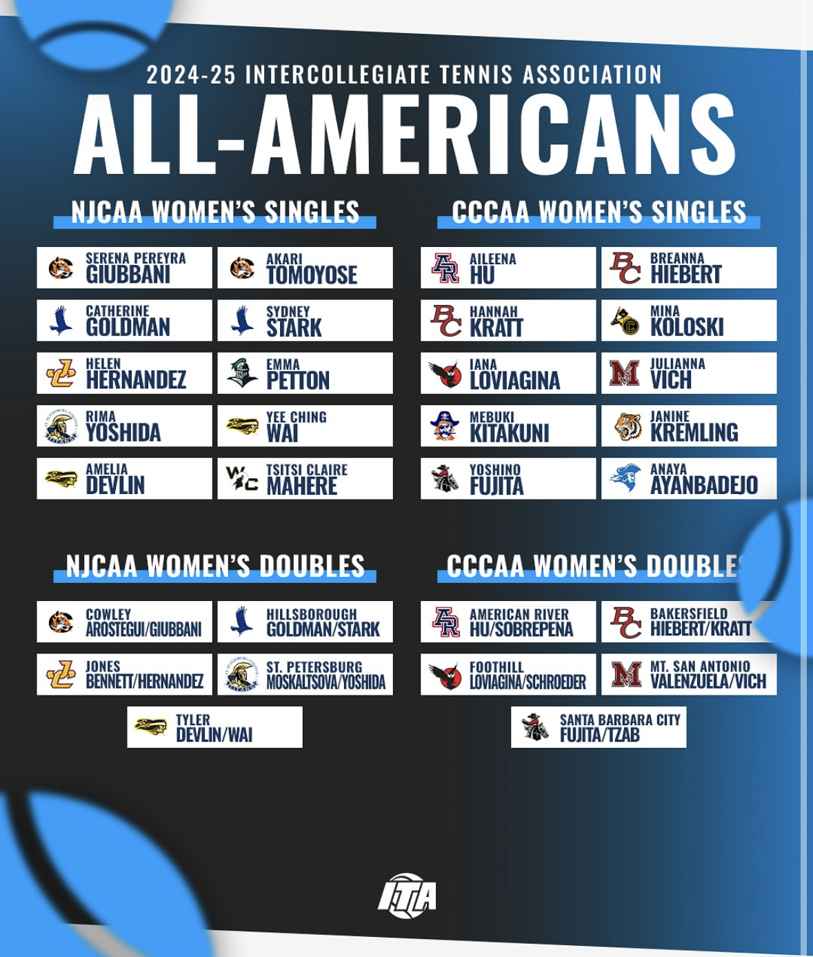 入学後はチームの中心選手として活躍し、団体戦で全米チャンピオンに輝くとともに、自身も単複両方でジュニアカレッジの全米10位以内にランキングされました!
